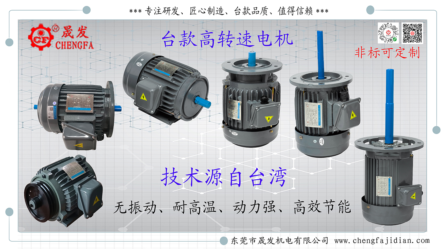 晟發(fā):專注于研發(fā)、制造:臺灣款電機、高速電機、精密磨床電機、非標電機等